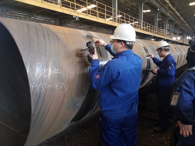 圖三 質(zhì)檢班員工在給東帝汶項目鋼管做超聲波檢測