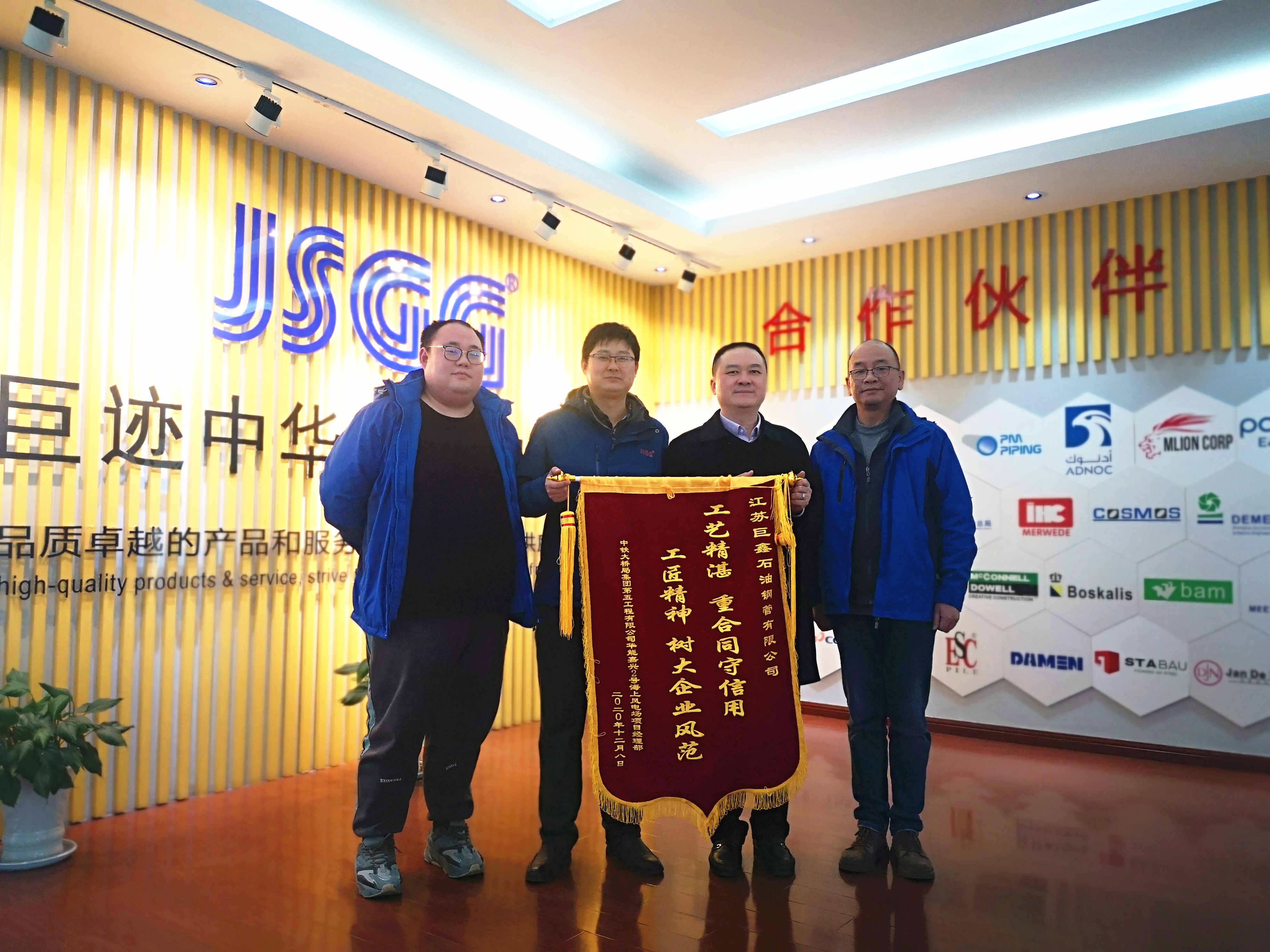 1月28日,中鐵大橋局集團第五工程有限公司華能嘉興2號海上風電場項目部送來的“工藝精湛 重合同守信用 工匠精神 樹大企業(yè)風范”錦旗一副,項目部來送錦旗的同志說以此來表達巨鑫鋼管長期以來為工程提供的優(yōu)質熱情服務。