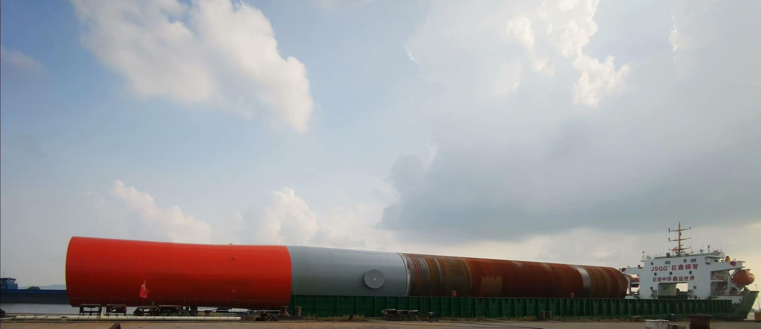由巨鑫鋼管加工制造的“巨無霸”海上風電鋼管樁,是中國華能集團嘉興2號海上風電項目上, 施工單位:中鐵大橋局集團第五工程有限公司,鋼管樁規(guī)格型號:Φ6500~7500×65~85×77000,單重:1200噸