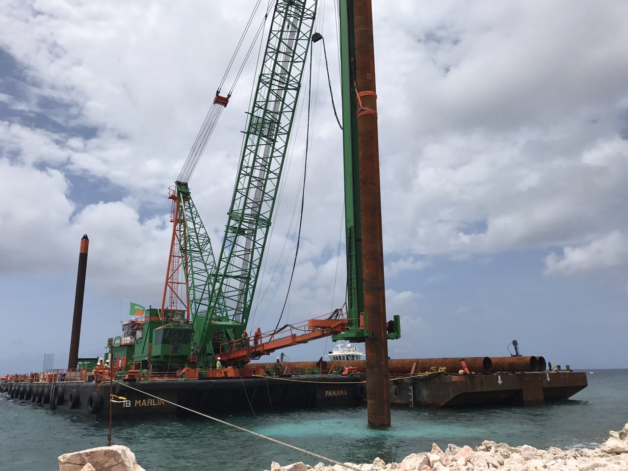 該合同鋼管樁沒(méi)有吊耳,只在樁頂部位鉆了兩個(gè)直徑100mm的孔,吊裝時(shí)全部采用吊帶。這種結(jié)構(gòu)既環(huán)保,又確保了鋼管樁防腐層質(zhì)量不受破壞。